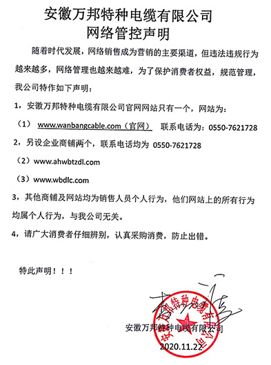 鄭重聲明:安徽萬邦特種電纜有限公司官方網站為:www_wanbangcable_com.wc001.cn,除此之外無任何子網站或合作網站,其余均為假冒偽劣。電話:0550-7621728 13485756353 地 址:安徽省天長市滁州高新技術產業開發區經四路29號